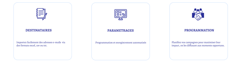 Notre plateforme d'e-mailing est conçue pour être conviviale, offrant une interface simple pour faciliter la gestion de vos campagnes par e-mail.